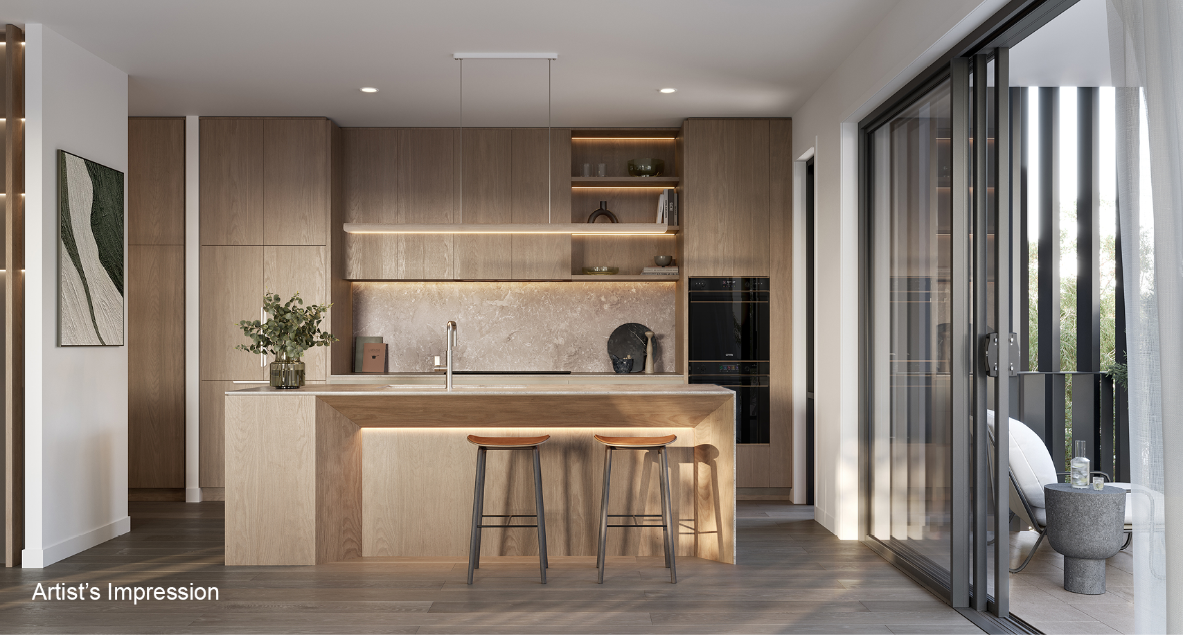 *Artist's impression as at 28.03.2024 was produced prior to receipt of all final planning approvals and prior to commencement of construction and is subject to change. The information, image and artist's impression depicting exteriors and interiors are intended only as a guide and are not to be relied on as a representative of the final product. Furnishings are not included. Landscaping and other aspects of the project may differ from this image. The view depicted is not to be taken as a representation of the final view.