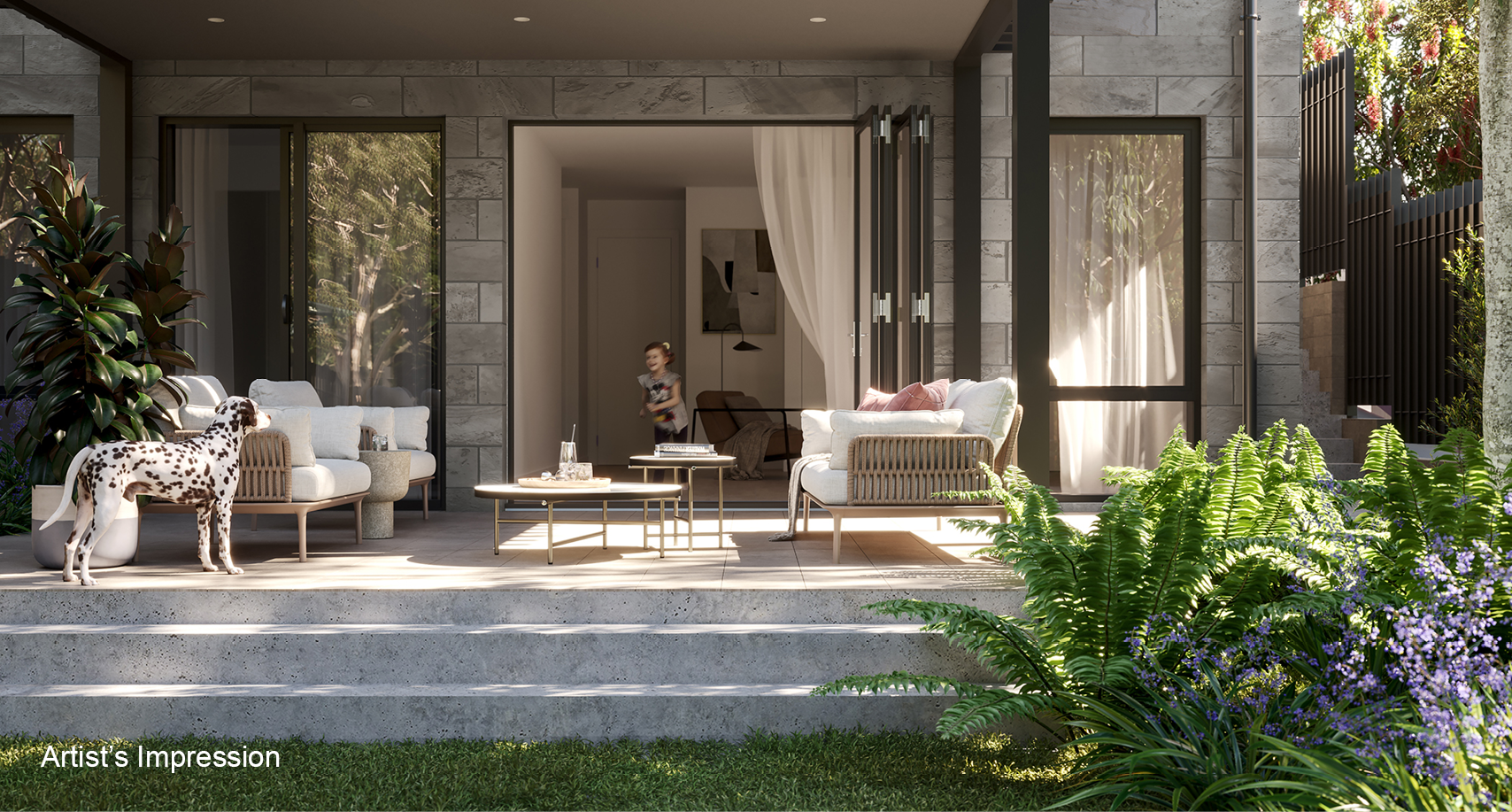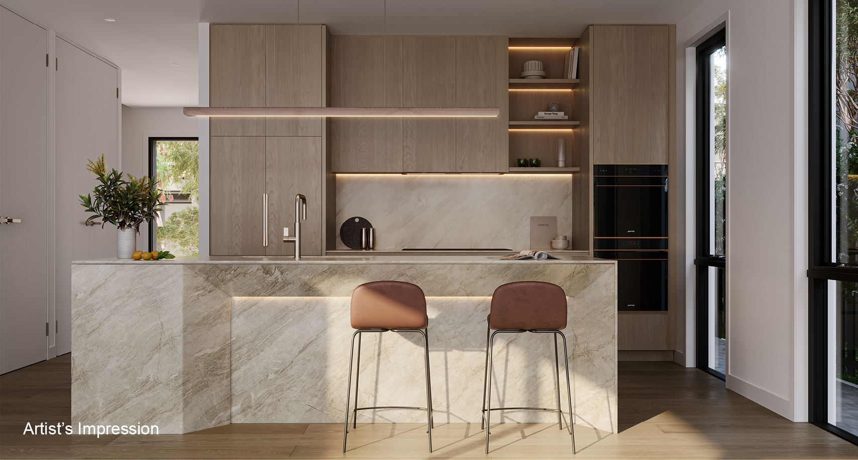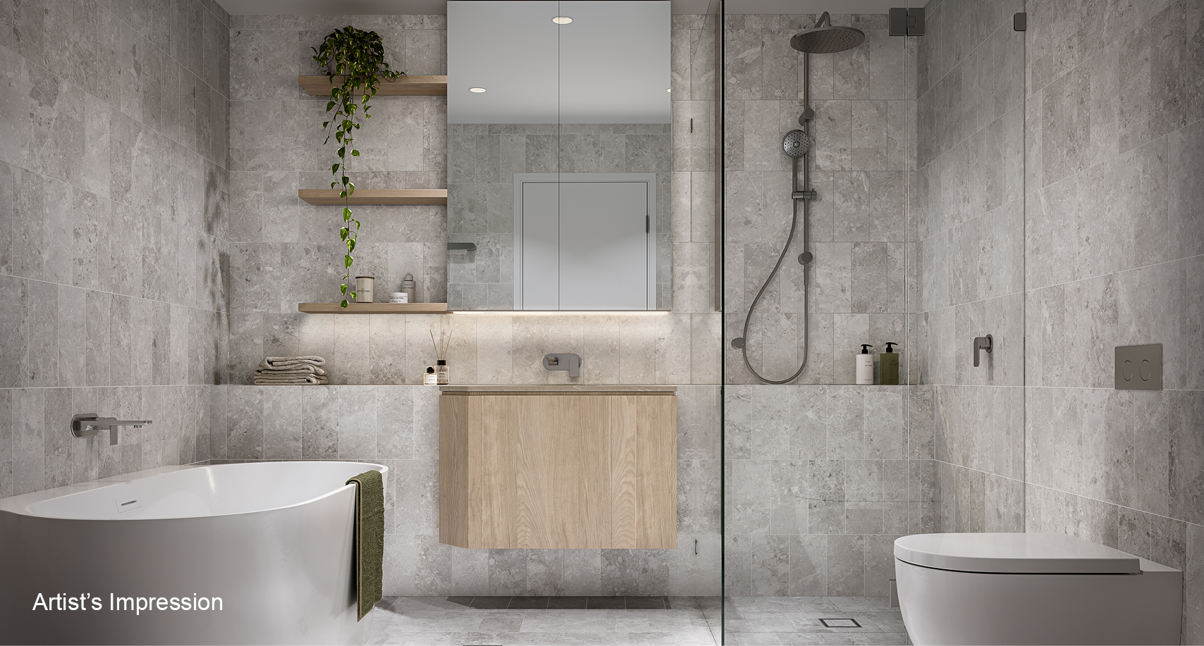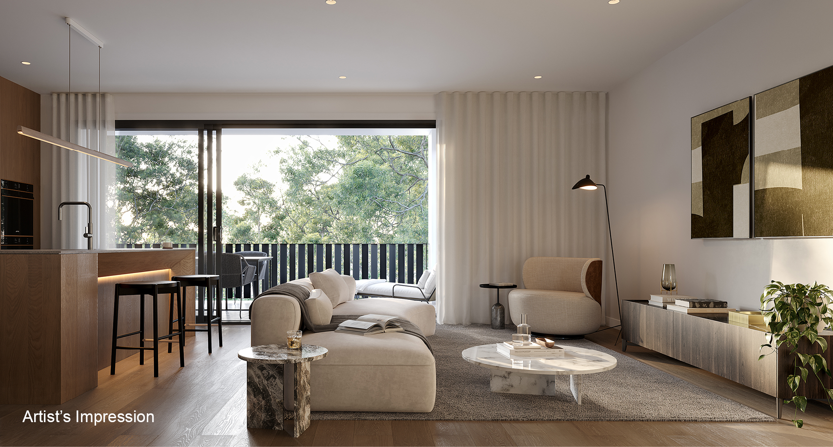 *Artist's impression as at 28.03.2024 was produced prior to receipt of all final planning approvals and prior to commencement of construction and is subject to change. The information, image and artist's impression depicting exteriors and interiors are intended only as a guide and are not to be relied on as a representative of the final product. Furnishings are not included. Landscaping and other aspects of the project may differ from this image. The view depicted is not to be taken as a representation of the final view.